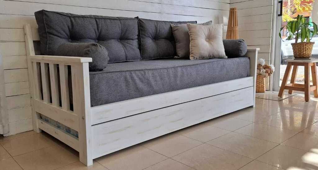 🛋SUPER COMBO!! Diván Cama Berlín Con respaldo (2 x 0.90Mts) + Carro Cama. Blanco Vintage (pintura tizada y laca) + Kit ( Funda Colchón + 2 Almohadones Respaldo + 2 Caramelos) Chenille Plain o Alpha Anti-desgarro Color a Elección + Colchón Superior 17 cm Linea Eco + Colchón Carro Cama 13 cm.