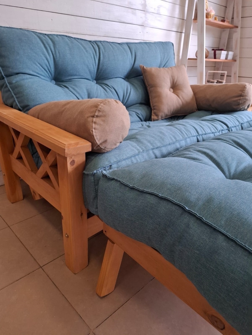 FUTON 2 CUERPOS MACIZO PATA 3 X 3 (1.55 x1 Mts) + PIECERA (1.40X0.60) SUPER REFORZADO. COLOR ROBLE CLARO + COLCHON CLASICO CHENILLE PLAIN CON TRATAMIENTO ANTI-DERRAME. COLOR A TU ELECCION.